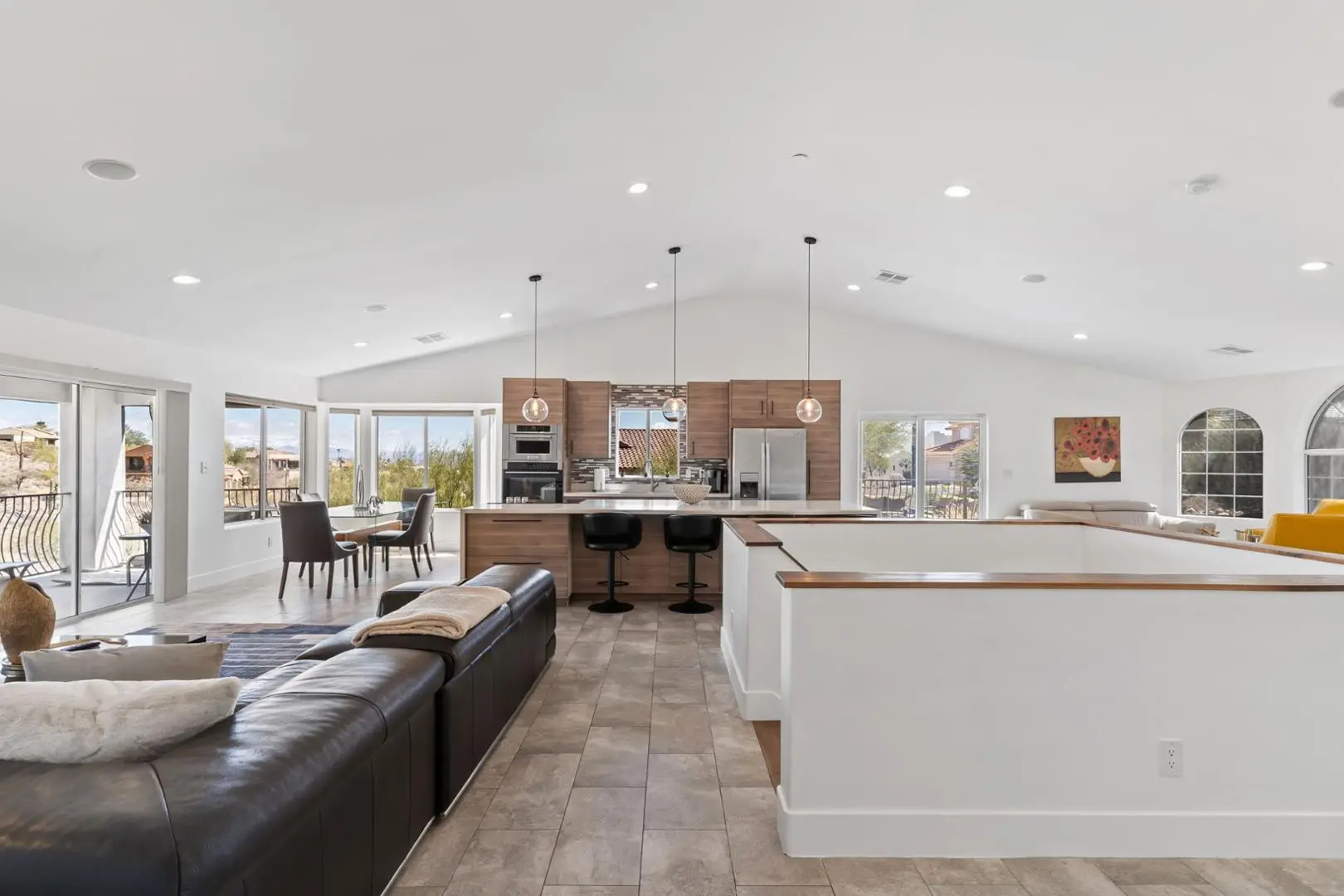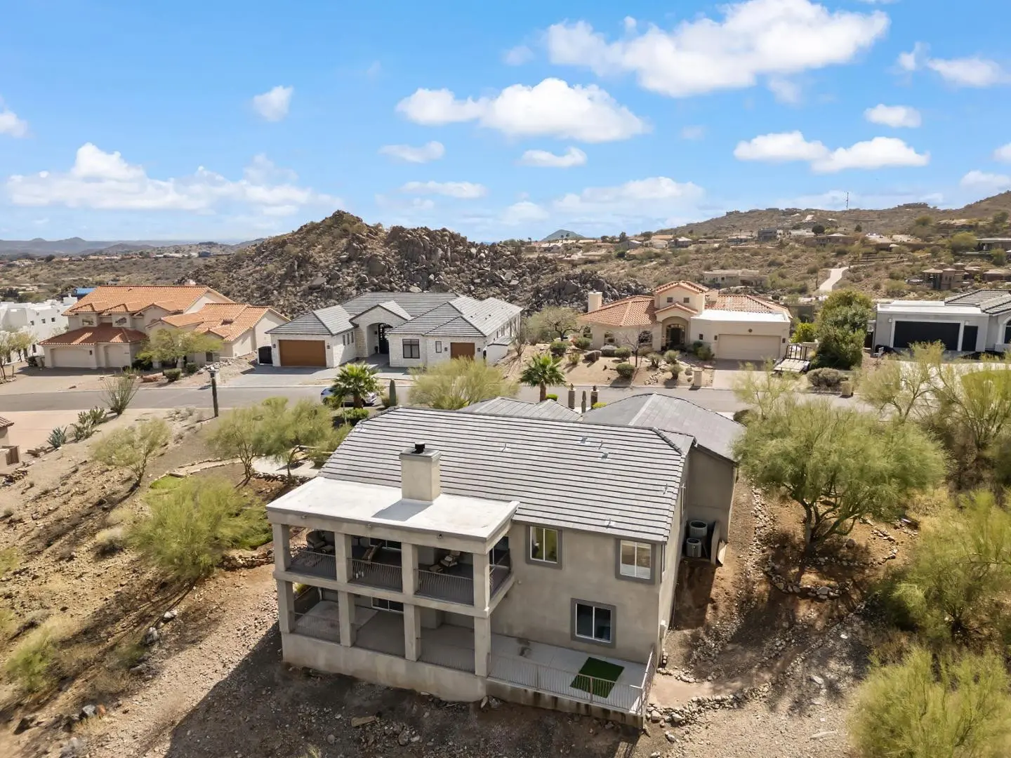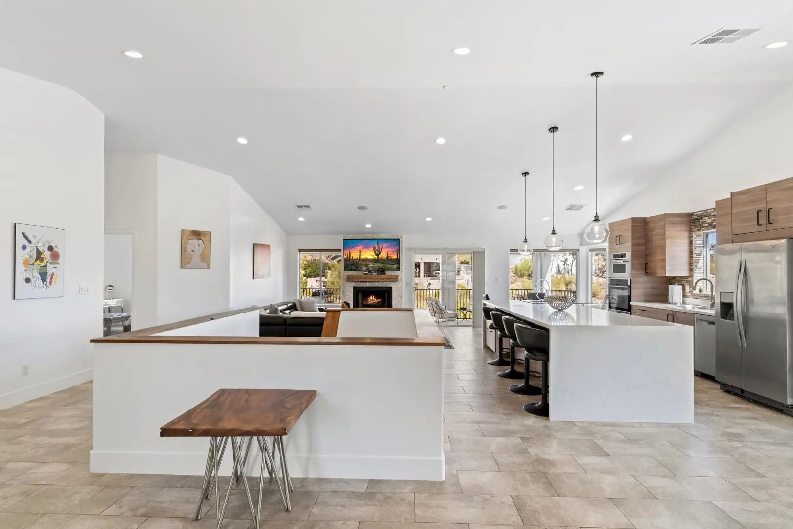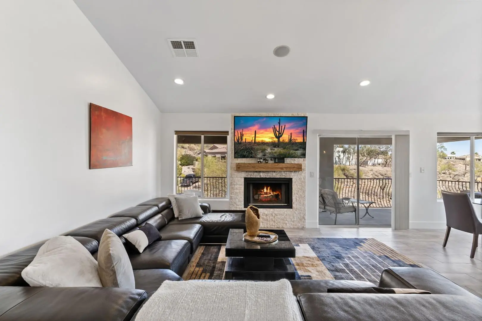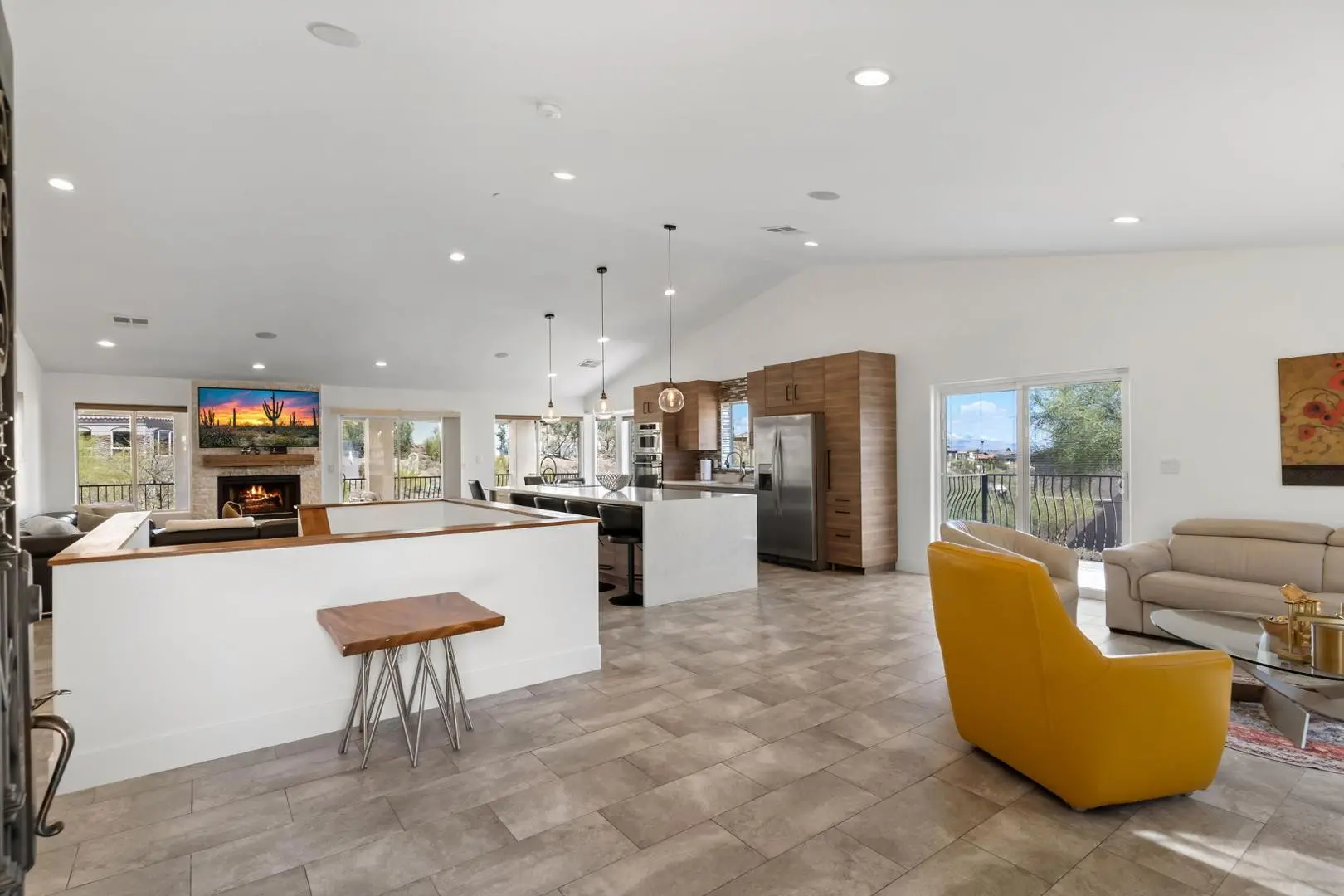Experience luxury living in this stunning home with breathtaking canyon, mountain and city light views. This contemporary 3-bedroom, 3-bath residence offers an elegant yet comfortable retreat with impeccable design and modern amenities. Step into the main level featuring an expansive great room with a cozy fireplace, perfect for relaxing while enjoying the scenic surroundings. The large, full-length patios on both living levels provide the ultimate indoor-outdoor experience, making them ideal for entertaining. The primary bedroom, complete with a steam shower and an additional bedroom are conveniently located on this floor. The heart of the home is the kitchen, showcasing a waterfall quartz countertop, designer cabinetry and top-tier appliances, creating a seamless blend of style and