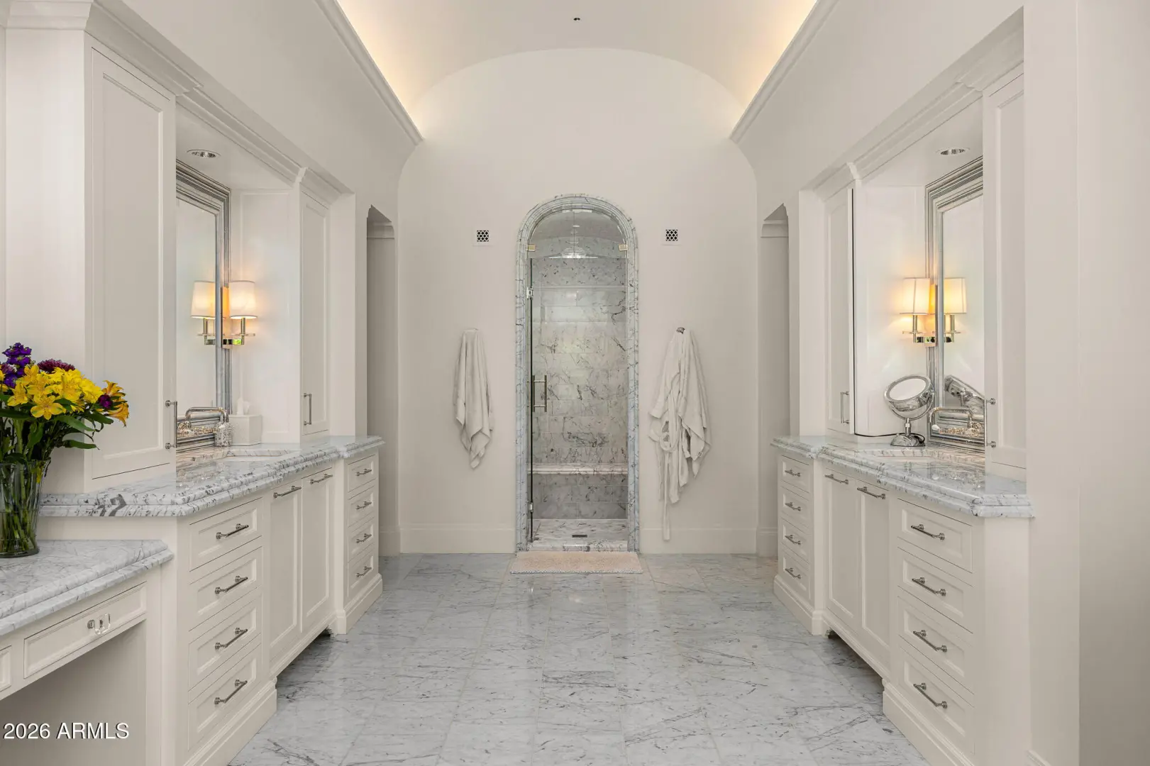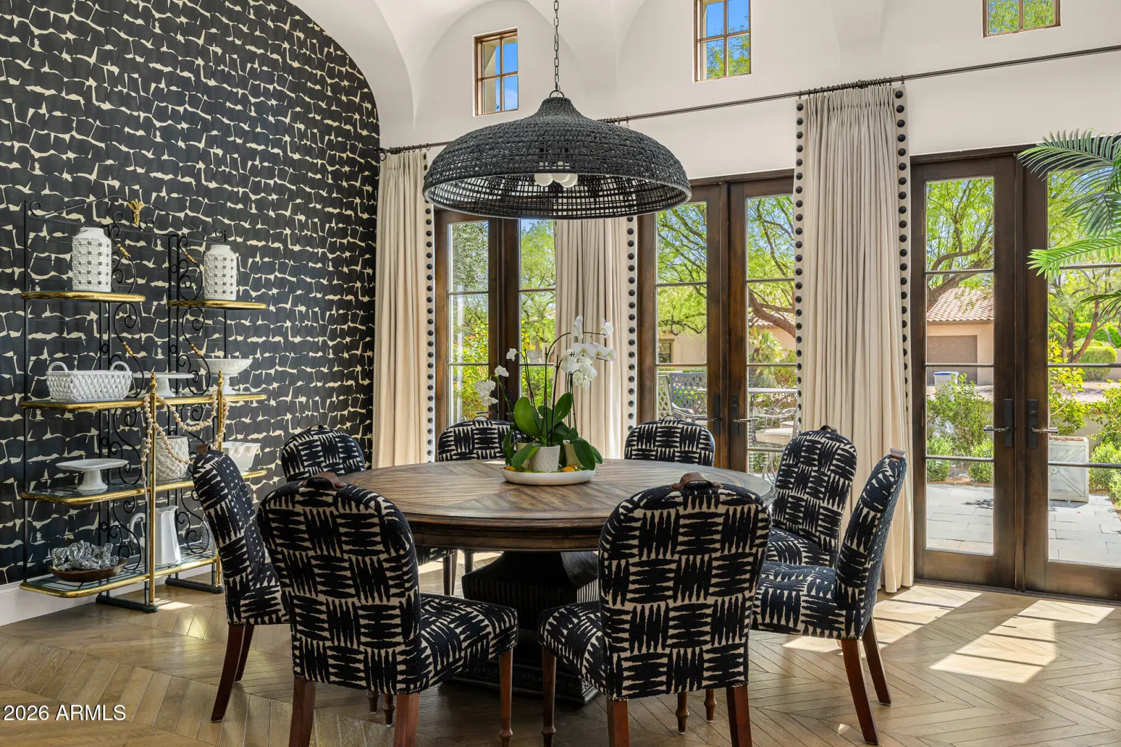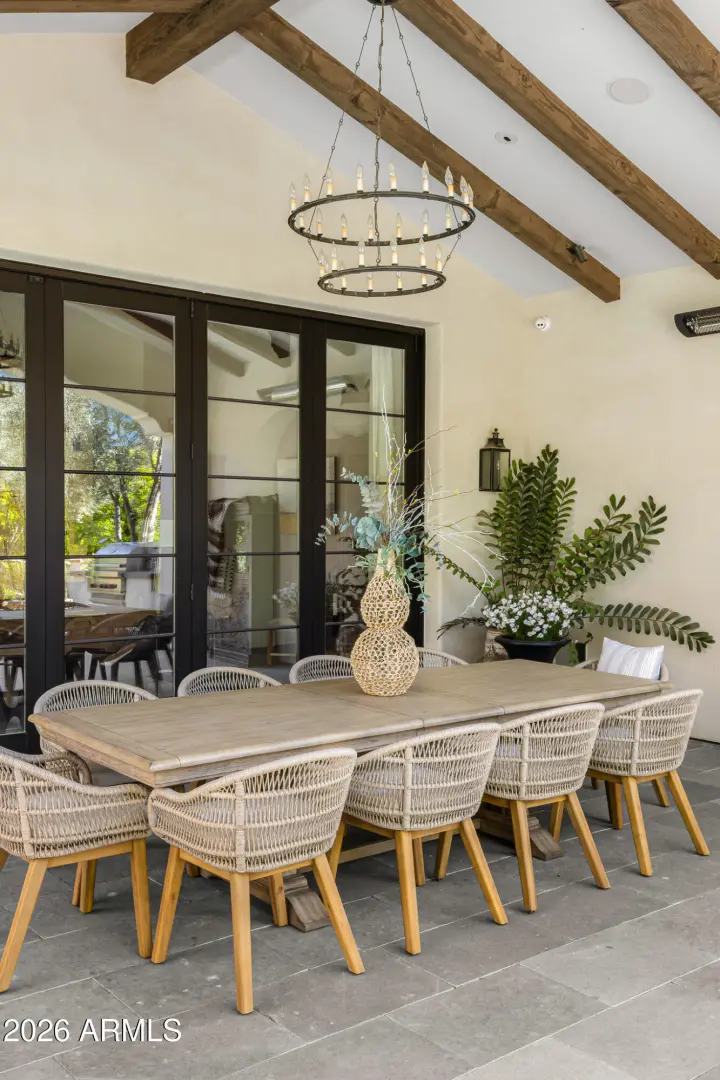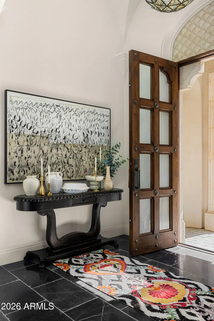 Privately gated and set on 1.1 acres of lush, mature landscaping, this timeless Santa Barbara estate offers unobstructed mountain views in the heart of Paradise Valley's coveted Equestrian Trails. Designed by renowned architect Matthew Thomas, built by Mike Foster Custom Homes, with landscape design by Berghoff Design Group and curated lighting by Walter Spitz, this 9,347 square foot residence is a true collaboration of craftsmanship and design excellence. A grand entry reveals perfectly framed views of the saltwater pool and manicured grounds, setting the tone for the home's effortless elegance. Soaring ceilings, handcrafted architectural details, and expansive living spaces create a refined yet inviting atmosphere. The thoughtfully designed floor plan includes five spacious ensuite ....